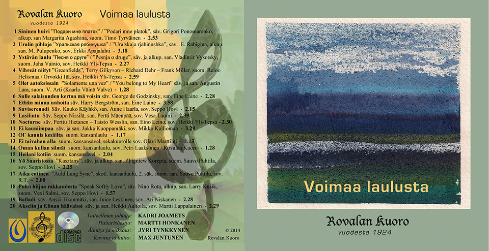 Rovalan kuoro: Voimaa laulusta CD, 2014. Rovalan kuoro, the oldest choir in Lapland, released its first official record to mark its 90th anniversary. I sang tenor and designed the cover of the CD.