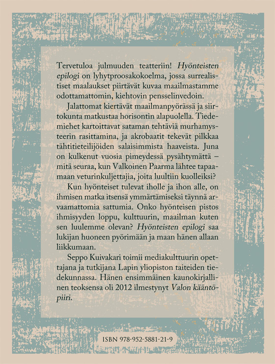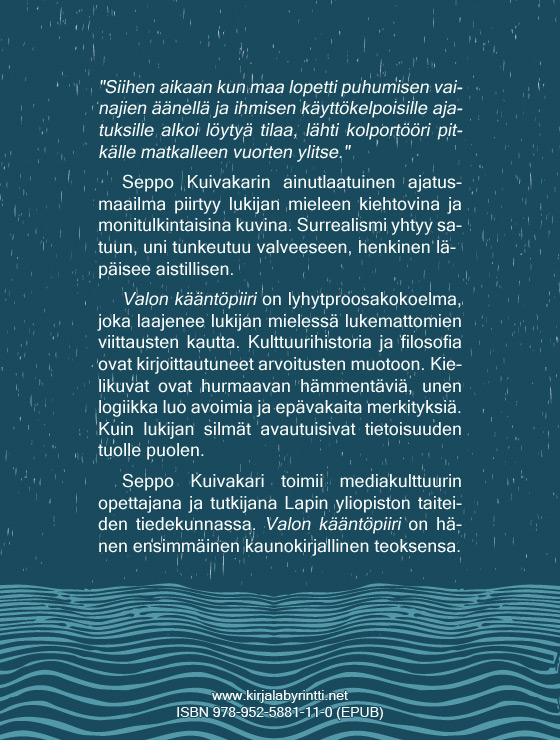 My works describe the tensions controlling our existence in the world. The books explore different manifestations of our culture, while telling stories about the dialogue between the known and unknown. Valon kääntöpiiri lingers by the borderlines between sleep and wakefulness, while Hyönteisten epilogi visits the bottomless pit between humanity and animality. My stories are independent incidents concerning the clash of these forces.