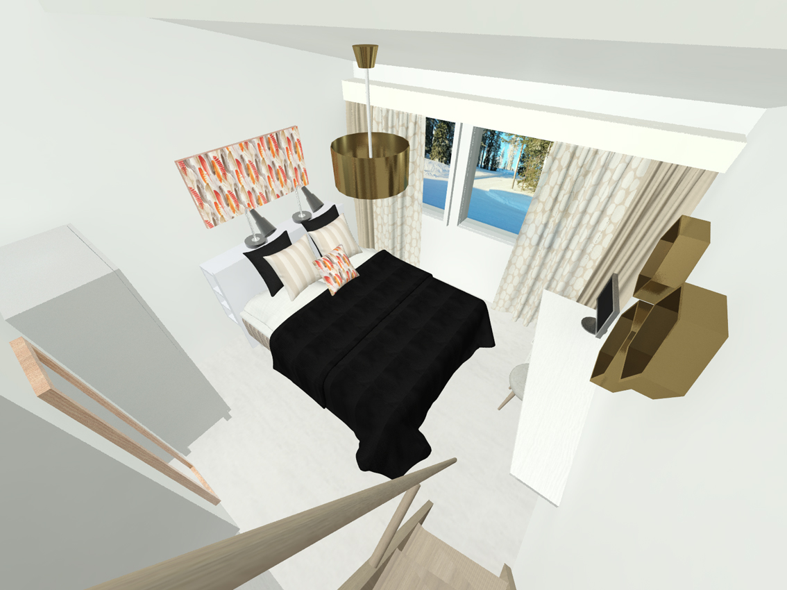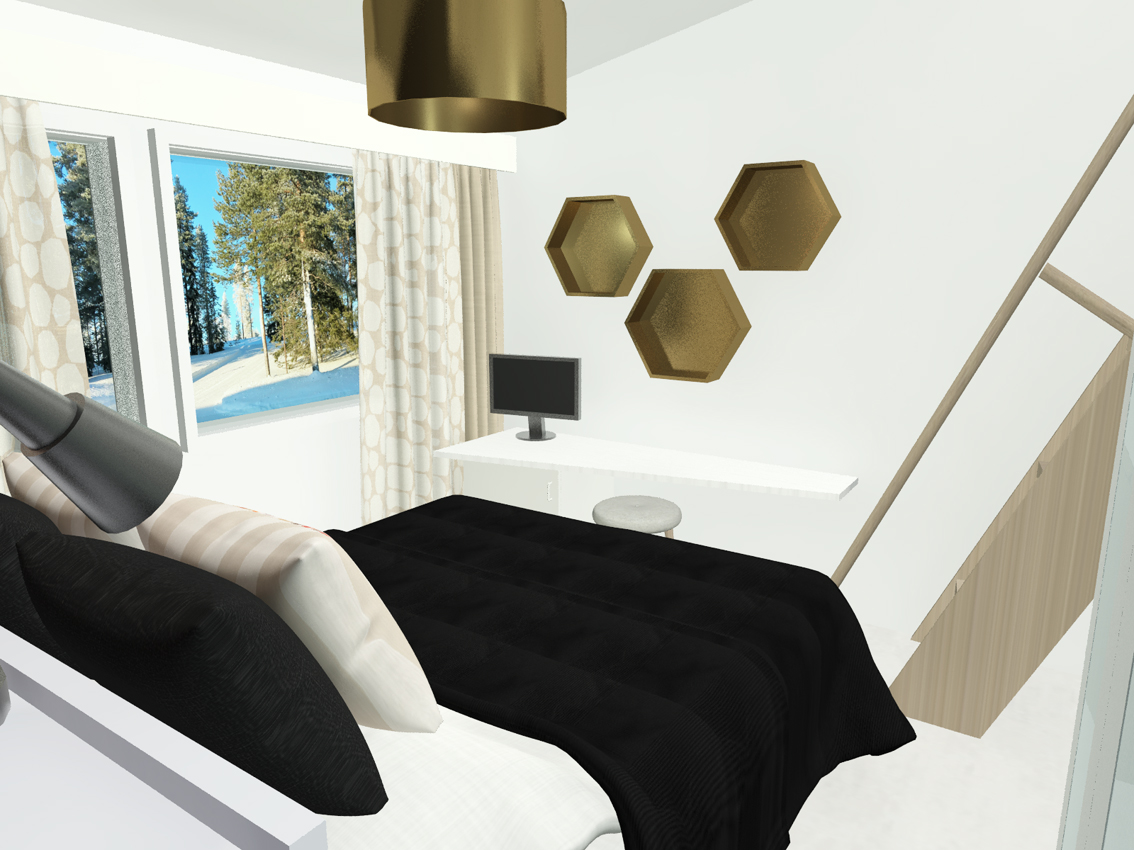 Tilasuunnitelman lähtökohtana oli luoda Posion hotelli Kirikeskuksen hotellihuoneisiin yhtenäinen kodikas ilme sekä rauhallinen tunnelma. Hotellin ympäristö huomioiden tilan sisustus on arktinen ja kaikkiin vuodenaikoihin sopiva ja se on suunniteltu houkuttelemaan niin kotimaisia kuin ulkomaisia asiakkaita. Materiaalien ja toimivien kalusteratkaisujen kautta tilasta on saatu miellyttävä käyttää ja katsoa. Tila on mallinnettu 3ds Max Design -ohjelmalla.