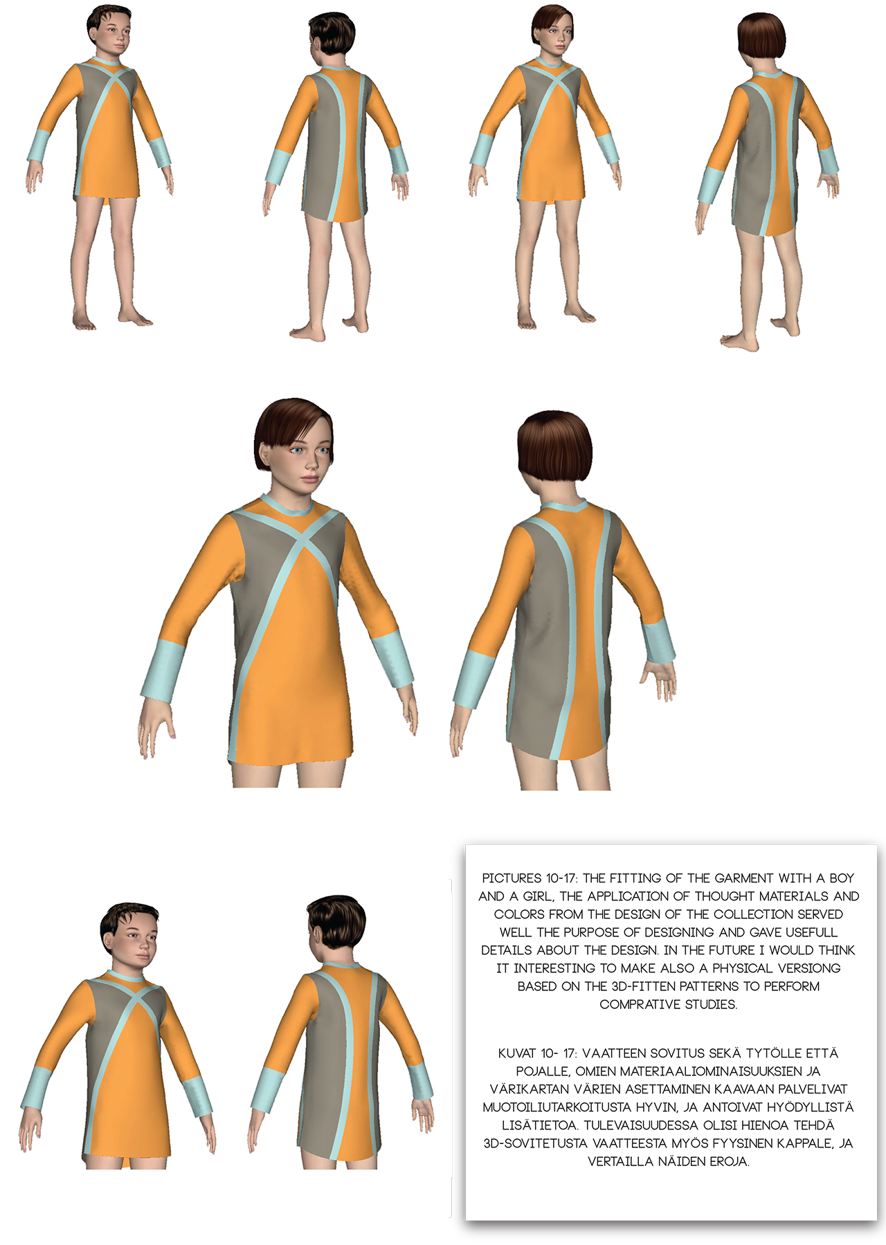 Lasten vaatetus -kurssilla suunniteltu asukokonaisuus, joka koostuu tunikasta ja shortsi-leggings-yhdistelmästä. Vaatteiden lisäksi kokoelmassa hyödynnettiin kestävän kehityksen ajattelua suunnittelemalla vaatteille ympäristöystävälliset huolto-ohjeet ja kankaiden leikkuujätteestä tehtävät pehmoplaneetat. Yksi suunnitelluista vaatteista 3D-mallinnettiin Lectra Modaris -ohjelmalla.