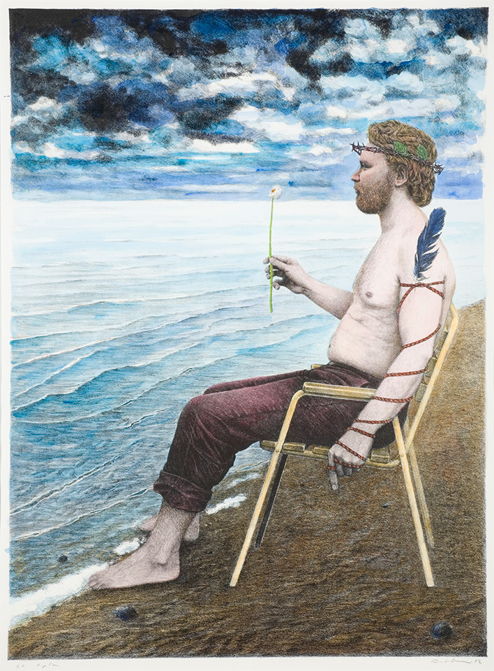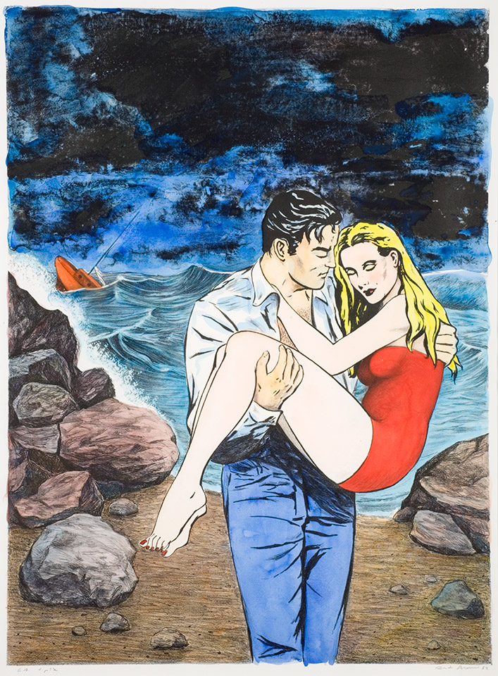 Risto Suomi: Köyhän miehen Odysseia III. 1982. Grafiikka, litografia, väri. 80 x 60 cm. Lapin yliopisto, Rovaniemi; ravintola Felli, peräseinä.