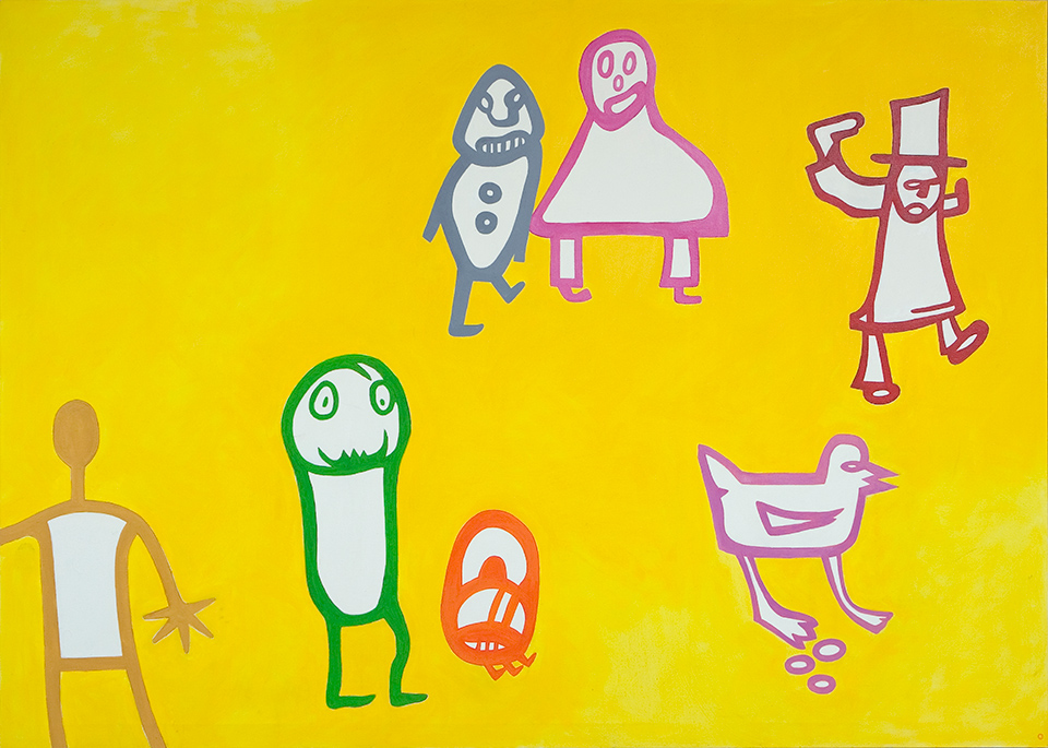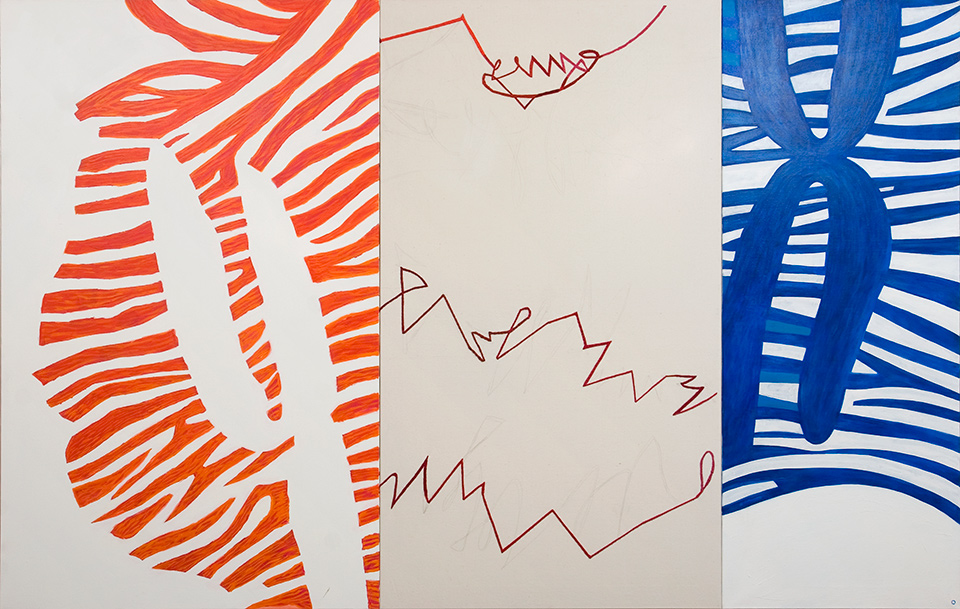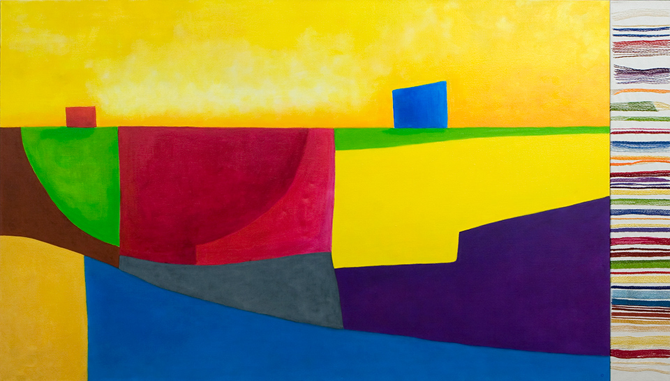 Jarmo Mäkilä: Matka. 1986. Maalaus, akryyliväri. 90 x 170 cm. Lapin yliopisto, Rovaniemi; A-siipi, 2. krs. Kokoushuone.