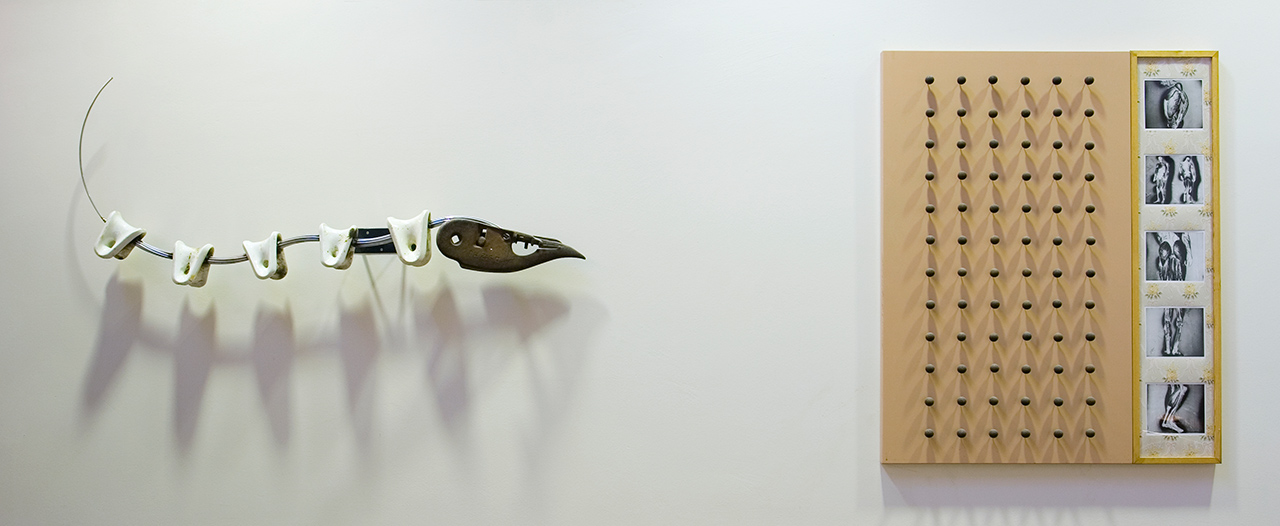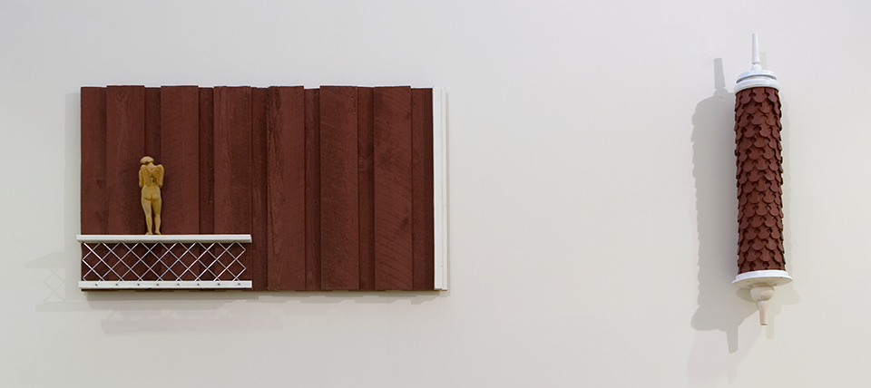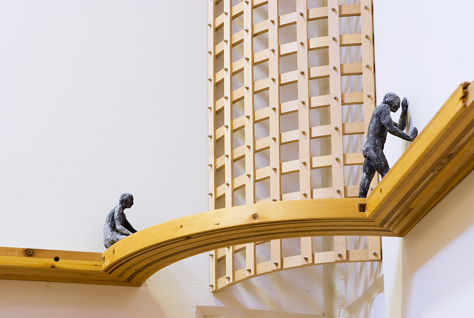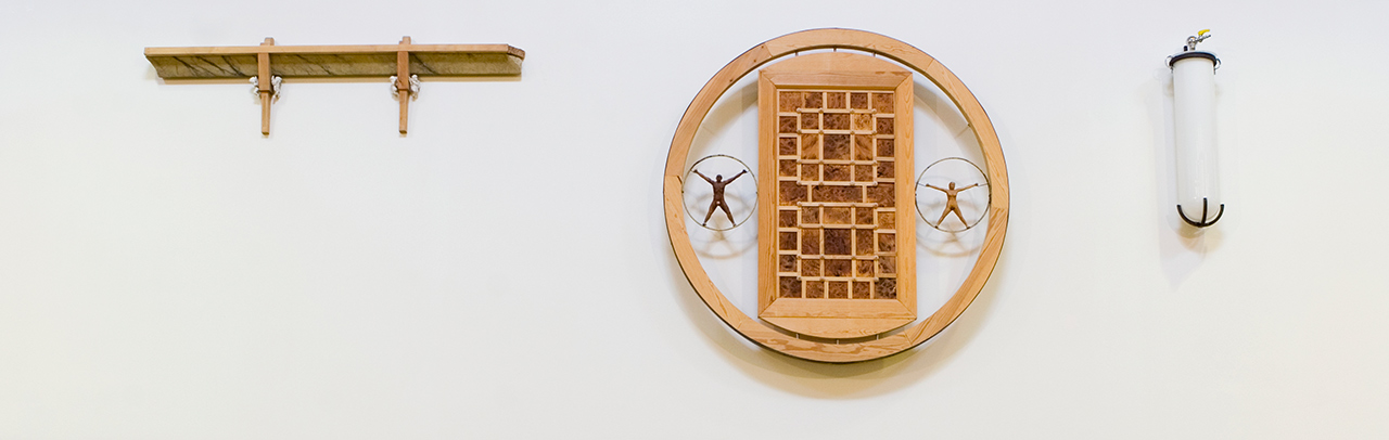 Tom Engblom: Synti ja häpeä. 1997-98. Esinekooste, puu, teräs. 115 x 265 x 23 cm. Lapin yliopisto, Rovaniemi; kirjaston friisi.