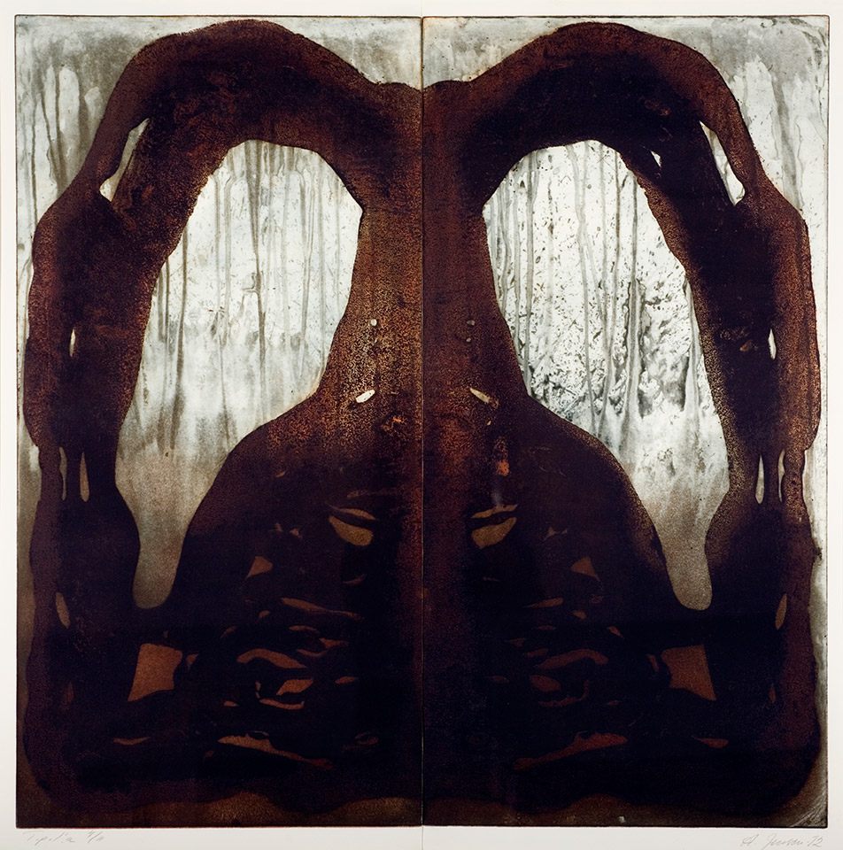 Anita Jensen: Savuava vesi. 1992. Grafiikka, syövytys. 99,3 x 99,3 cm. Lapin yliopisto, Rovaniemi; pääaula, ravintolan puoleisen seinän yläosa.
