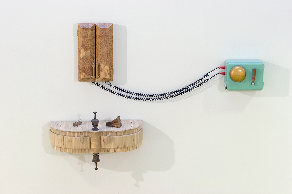 Tom Engblom: Aamu ja peili. 1993-98. Esinekooste, puu, esineitä. 118 x 175 x 35 cm. Lapin yliopisto, Rovaniemi; kirjaston friisi.