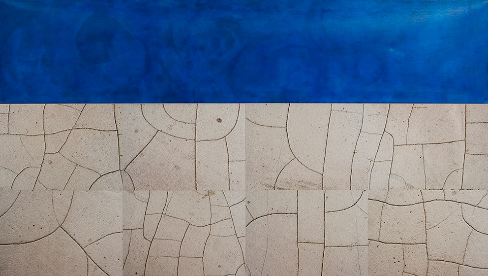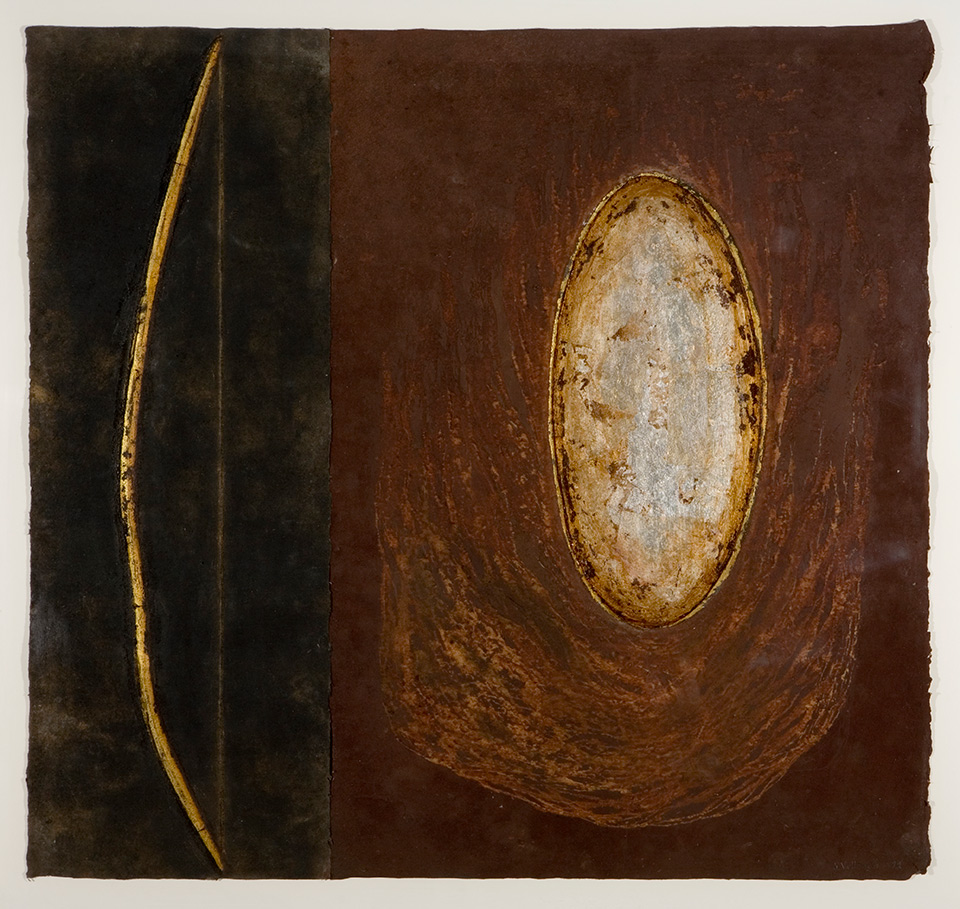 Senja Vellonen: Suuri peili. 1992. Maalaus, yhdistelmätekniikka, lehtikulta, lehtihopea, pigmentti, hautaterva, japaninpaperi. 84 x 90 cm. Lapin yliopisto, Rovaniemi; OTK:n kokoushuone.