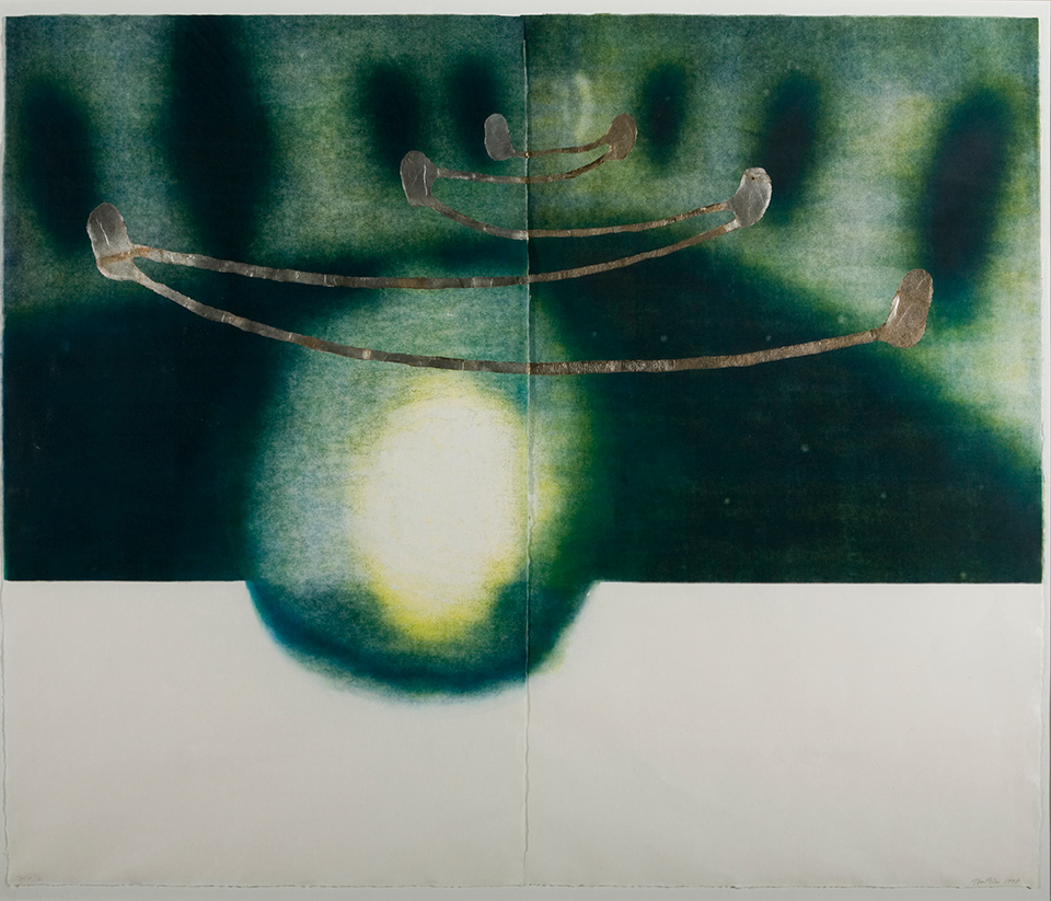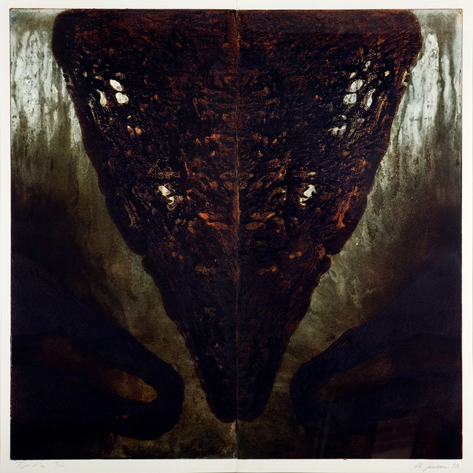 Tapani Mikkonen: Mar IV. 1991. Grafiikka, litografia, pronssi, reliefi. Litografia: 25,5 x 34,2 cm / reliefi: 18,5 x 21,5 x 5 cm. Lapin yliopisto, Rovaniemi; kirjasto 2. krs.