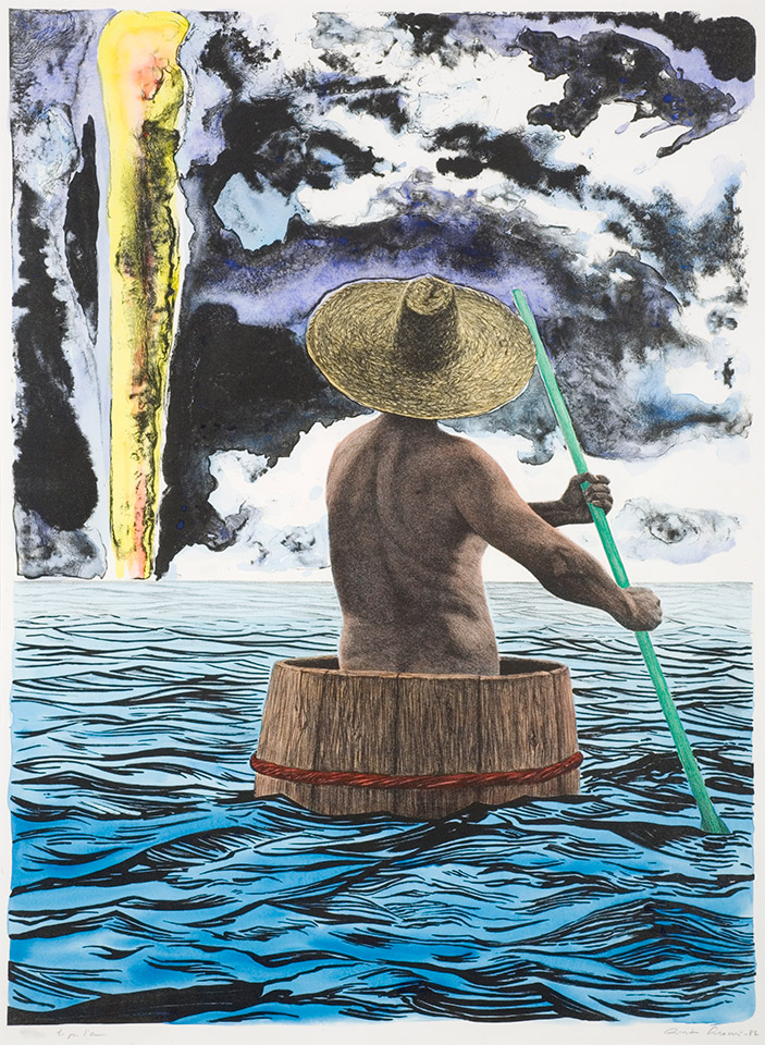 Risto Suomi: Köyhän miehen Odysseia II. 1982. Grafiikka, litografia, väri. 80 x 60 cm. Lapin yliopisto, Rovaniemi; ravintola Felli, peräseinä.