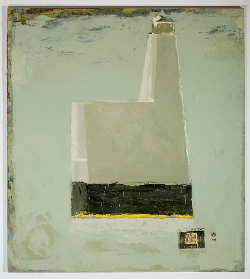 Maija Westerberg: Rajoilla, majakka. 1992. Maalaus, öljyväri, valokuva. 200 x 181 cm. Lapin yliopisto, Rovaniemi; Harjoittelukoulu, D-rakennus, portaikko.