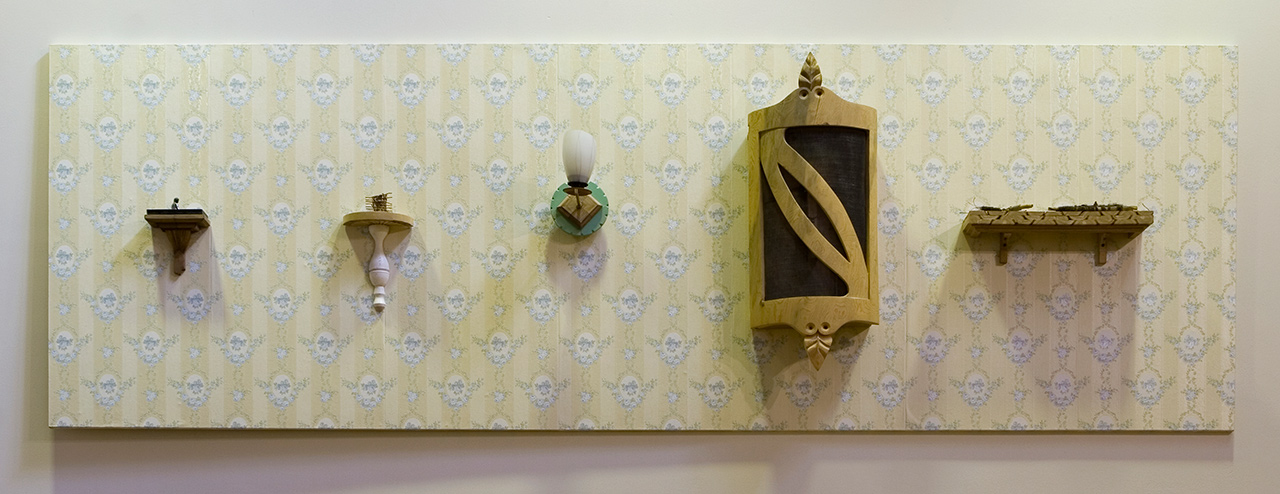 Tom Engblom: Unelmia. 1995-98. Esinekooste, tapetti, puu, esineitä. 120 x 360 x 20 cm. Lapin yliopisto, Rovaniemi; kirjaston friisi.