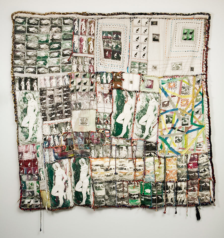 Lea Karjalainen ja Johanna Hänninen: Olet tässä. 2000. Maalaus, öljy, käsin kirjailtu tekstiili. 300 x 180 cm. Lapin yliopisto, Rovaniemi; harjoittelukoulu, B-rakennus 3. krs. porraskäytävä.