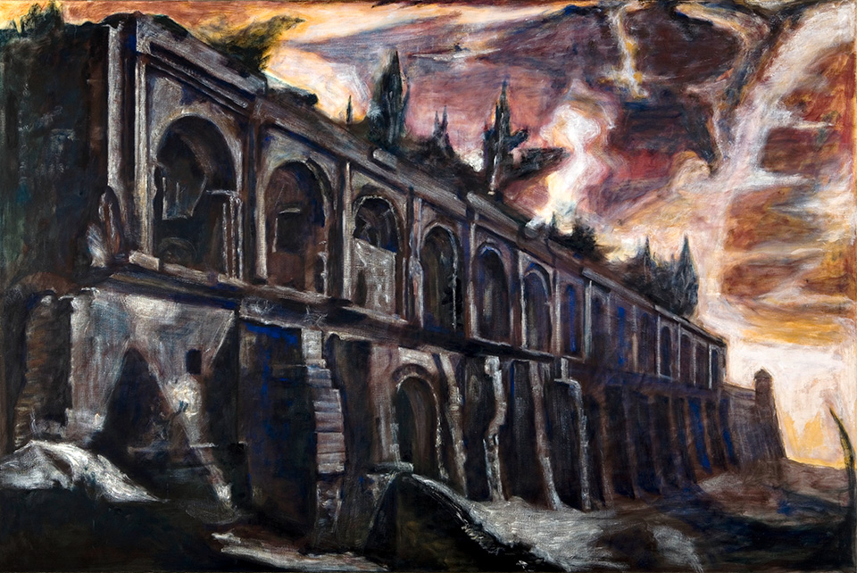 Ursula Kianto: Uponnut torni. 1991. Maalaus, öljyväri. 48 x 60 cm. Lapin yliopisto, Rovaniemi; rehtorin huone.