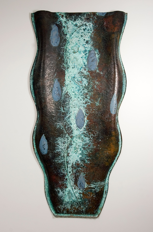 Eila Minkkinen: Liaani. 1991. Veistos, kupari repousse. 200 x 100 x 10 cm. Lapin yliopisto, Rovaniemi; pääaula, YTK:n portaiden yläpää.