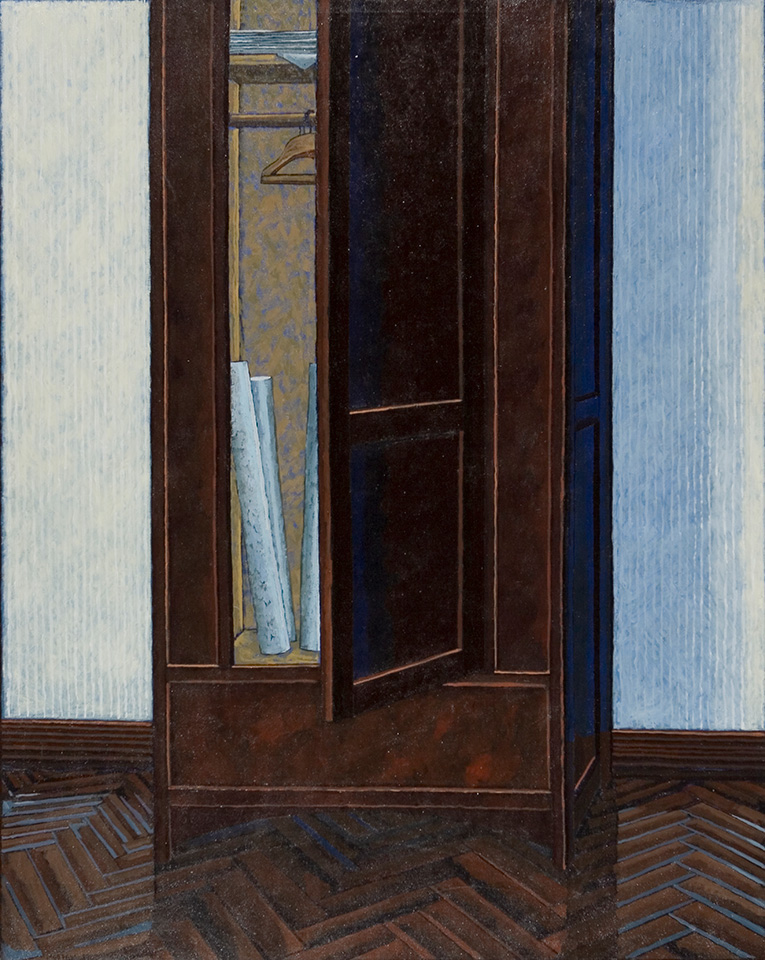 Paavo Pelvo: Kaappi. 1983. Maalaus, öljyväri. 150 x 120 cm. Lapin yliopisto, Rovaniemi; kirjasto 2. krs. peräseinän sivusta.