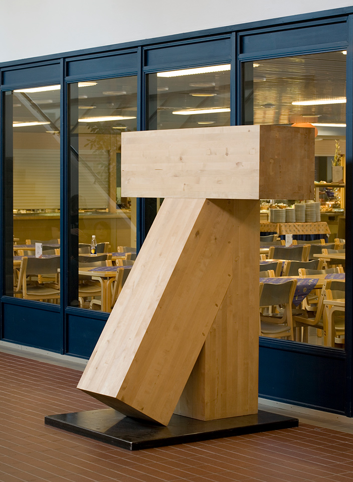 Matti Nurminen: Nimetön. 1986. Veistos, koivu. Korkeus 185 cm. Lapin yliopisto, Rovaniemi; pääaula, ravintolan seinusta.