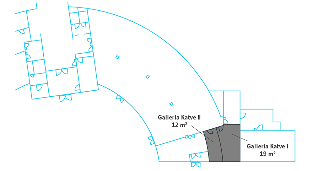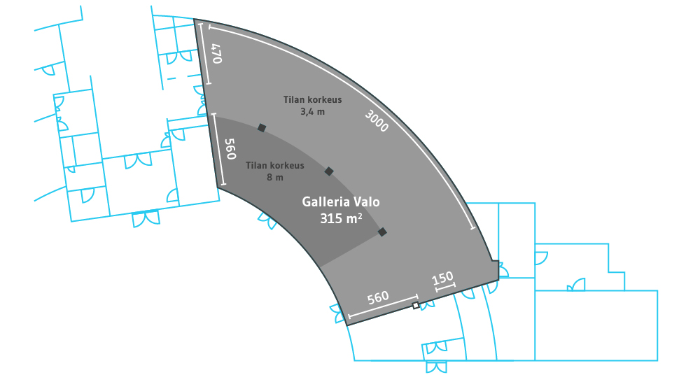 - Näyttelytilan pisin ripustusseinä noin 30 metriä pitkä, jonka puolelta